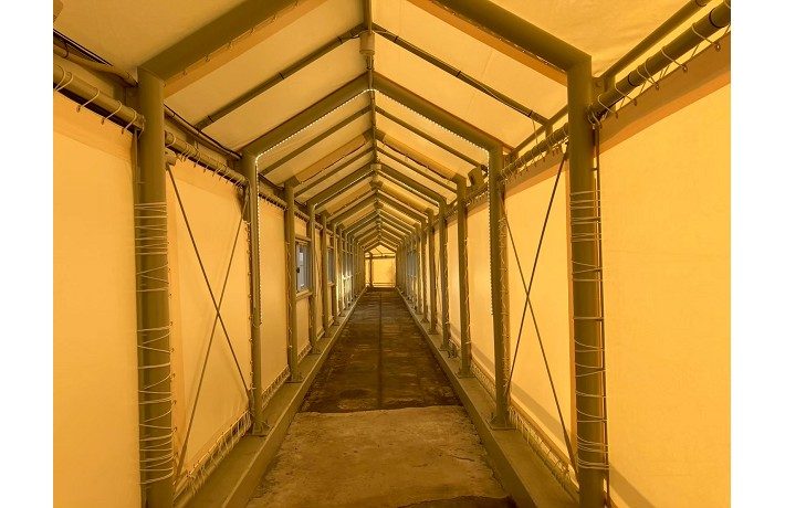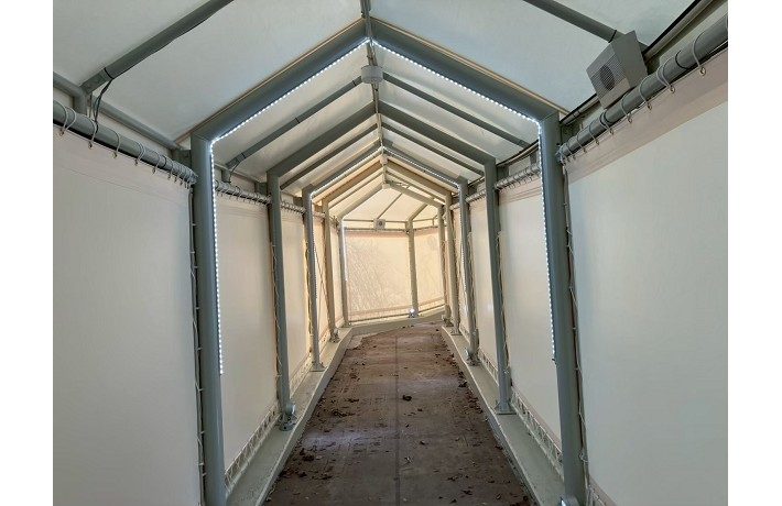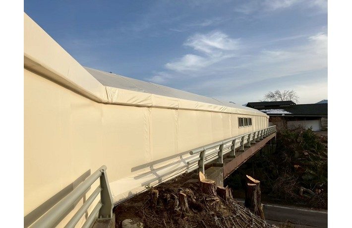 群馬県にて間口2.4m 奥行50m 軒高2.3m通路テントの張替工事を行いました。