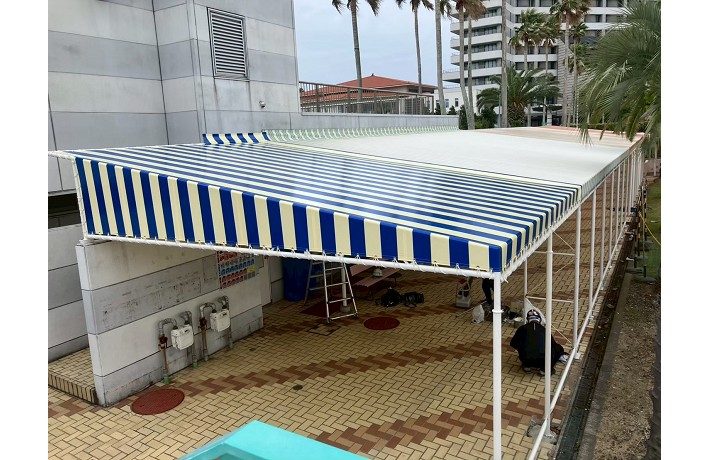 愛知県にて長さ7.2m 奥行0.7m庇テントの張替工事を行いました。・・・