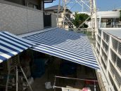 店舗や住宅の軒先を彩り豊かにするオーニング、安心の国産メーカー「テンパル」のオーニングに自社生産キャンパスを取り付けて施工致します。荷捌き場等の大型の上屋テントの施工も行っています。